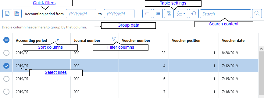 Tables are a key component of WINPACCS Cloud. As a rule all the tables in WINPACCS Cloud have the same structure, although sometimes symbols look different or certain elements are missing.